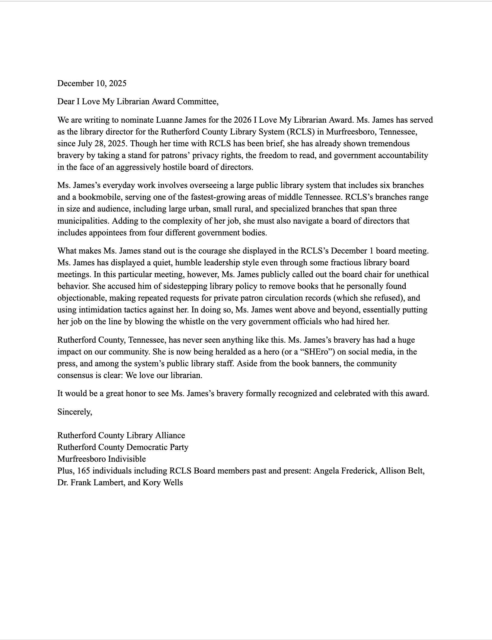 December 2025: Release statement of support for Luanne James in her endeavors to defend the freedom to read – “I Love My Librarian Award” 2026